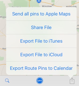 iCloud is probably the easiest way to export a file. With Road Trip Planner iOS, open a file and tap the action button on the bottom right of the toolbar as shown below in the first screenshot. Tap Export File to iCloud and then select the location where you want the file saved. After the file has been saved, select Open from the Road Trip Planner Mac File menu, and select the file you just exported -- see second screenshot below. For more info on the Road Trip Planner Mac and iCloud, click here.