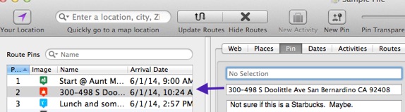 Route pins, for defining a route. For example, from your house to a campground and back you would drop a route pin at your house, one at the campground, and possibly another pin back at your house as the last stop. When you click on the Update Routes button, the map shows routes between the route pins.