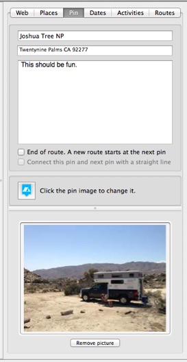 Drag and drop a picture to the lower part of the pin panel to save the picture with the file. Choose a picture from your iPhoto library by clicking the iPhoto button as shown by the arrow below.