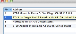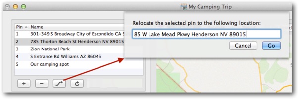 To relocate a pin by entering a new address, select it from the pin list, and click the relocate button on the bottom of the list. A window appears where you can enter the new location as shown below. In this example, the address was obtained from copying a place address to the clipboard.