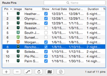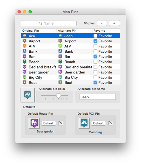 Select Map Pins from the File menu to display this window. This is your library of available Map Pins for your Road Trip Planner documents. Use this window to set your favorite map pins, delete them, change their color, rename them, export, and add more map pins.