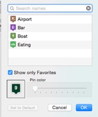 When you click a map pin in the Pin pane as shown below, a window appears allowing you to choose a new map pin. Check Show only Favorites to show only your favorite map pins as selected in the above Map Pins window.