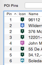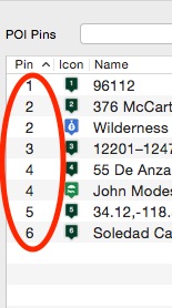 POI pins can be given any pin number you like. Edit the pin number inline (click the mouse in the column to edit). The pin number can be used to associate the POI pin to a route pin, or to aid in sorting the POI pins, or for any purpose you desire.