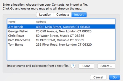 From Excel. import address from an Excel file into your Contacts. Once the address are in your Contacts, import them into Road Trip Planner from your Contacts. Alternatively export the address as a text file and use the Import function below.